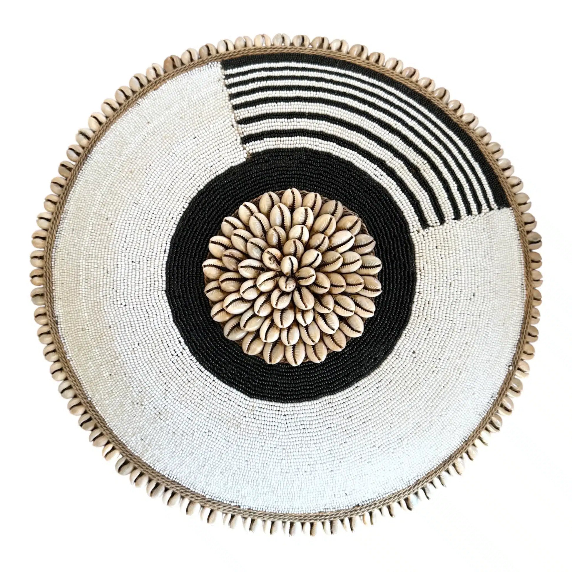 The beaded Cameroon shields bring Afrochic elegance into any space, admired by decorators and collectors of African décor. Each shield is handcrafted by artisans, inspired by the protective emblems once carried by Tikar Tribe hunters and warriors. Symbolising wealth and status, they feature intricate adornments of beads, cowrie shells, and Manila string. These one-of-a-kind pieces make striking wall or floor displays.